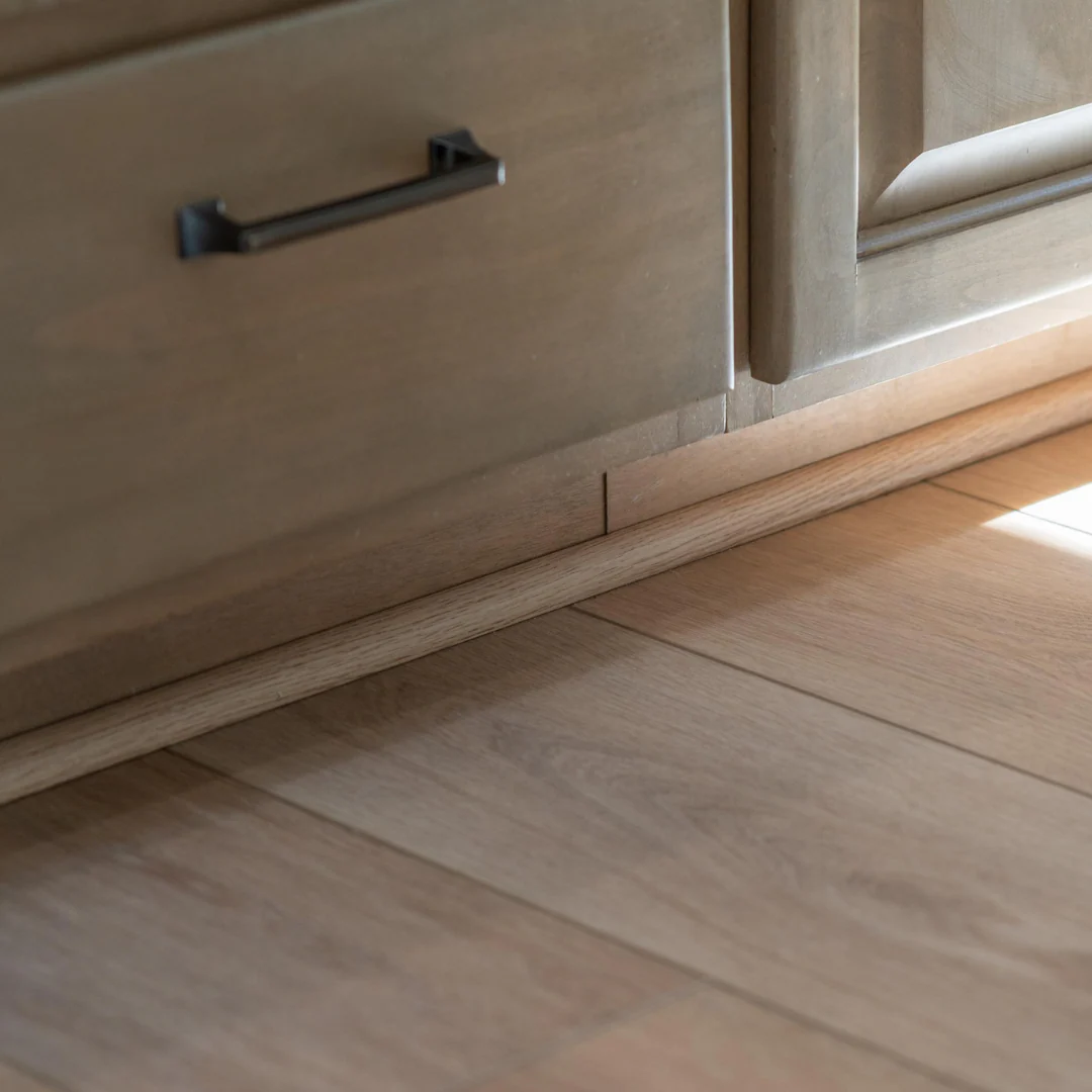 This quarter-round trim piece is 11/16" x 11/16" x 72". This universal transition piece works with our Modin Base, Craftsman, Herringbone and Signature models. Please make sure to select the correct color.